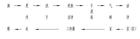 图5.2.4 医药洁净室(区)人员净化程序 5.3.1 医药洁净室(区)的原辅物料、包装材料和其他物品出入口,应设置物料净化用室和设施。 5.3.2 进入无菌洁净室(区)的原辅物料、包装材料和其他物品,除应满足本规范第 5.3.1 条的规定外,尚应在出入口设置供物料、物品灭菌用的灭菌室和灭菌设施。 5.3.3 物料清洁室或灭菌室与医药洁净室(区)之间,应设置气闸室或传递柜。 5.3.4 传递柜密闭性应好,并应易于清洁。两边的传递门应有防止同时被开启的措施。传递柜的尺寸和结构,应满足传递物品的大小和重量所需要求。传送至无菌洁净室(区)的传递柜应设置相应的净化设施。 5.3.5 生产过程中产生的废弃物出口,宜单独设置专用传递设施,不宜与物料进口合用一个气闸室或传递柜。 5.4.1 饮用水的制备和使用,应符合下列要求: 1、饮用水的制备方式,应保证其水质符合现行国家标准《生活饮用水卫生标准》GB5749 的有关规定。 2、饮用水的储存和输送,应符合本规范第10.2.1 和10.2.2 条的规定。 5.4.2 纯化水的制备、储存和分配,应符合下列要求: 1、纯化水的制备方式,应保证其水质电阻率大于0.5MΩ·cm ,并应符合现行《中华人民共和国药典》的纯化水标准的规定。 2、用于纯化水储罐和输送管道、管件等的材料,应无毒、耐腐蚀、易于消毒,并宜采用内壁抛光的优质不锈钢或其他不污染纯化水的材料。储罐的通气口应安装不脱落纤维的疏水性过滤器。 3、纯化水输送管道系统应采取循环方式。设计和安装时不应出现使水滞留和不易清洁的部位。循环的干管流速宜大于1.5m/s,不循环的支管长度不应大于管径的6 倍。纯化水终端净化装置的设置应靠近使用点。 4、纯化水储罐和输送系统,应有清洗和消毒措施。 5.4.3 注射用水的制备、储存和使用,应符合下列要求: 1 注射用水的制备方式,应保证其水质符合现行《中华人民共和国药典》的注射用水标准的规定。 2 用于注射用水储罐和输送管道、管件等的材料,应无毒、耐腐蚀,并应采用内壁抛光的优质低碳不锈钢管或其他不污染注射用水的材料。储罐的通气口应安装不脱落纤维的疏水性除菌器。 3、注射用水的储存可采用65℃以上保温循环的方式,也可采用80℃以上或 4℃ 以下保温的方式。循环时干管流速宜大于1.5m/s。 4、注射用水输送管道系统应采取循环方式。 5、注射用水输送管道系统设计和安装时,不应出现使水滞留和不易清洁的部位。使用点不循环支管长度不应大于管径的6 倍。注射用水终端净化装置的设置应靠近使用点。 6、输送注射用水的不锈钢管道,应采用内壁无斑痕的对接氩弧焊焊接。需要拆洗的不锈钢管道宜采用卡箍式、法兰等优质低碳不锈钢卫生管件连接,法兰垫片材料宜采用聚四氟乙烯。不锈钢管道焊接后宜钝化。 7、注射用水储罐和输送系统,应设置在位清洗和在位灭菌设施。 5.4.4 医药洁净室(区)内工艺用水系统的验证,应符合附录 C 的规定。 6.1.1 医药洁净室(区)内应少敷设管道。工艺管道的干管,宜敷设在技术夹层或技术夹道中。需要拆洗和消毒的管道宜明敷。易燃、易爆、有毒物料管道应明敷,当需穿越技术夹层时,应采取安全密封措施。 6.1.2 管道在设计和安装时,不应出现使输送介质滞留和不易清洁的部位。 6.1.3 在满足工艺要求的前提下,工艺管道宜短。 6.1.4 工艺管道的干管系统应设置吹扫口、放净口和取样口。 6.1.5 输送纯化水的干管应符合本规范第 5.4.2 条的规定,输送注射用水的干管应符合本规范第5.4.3 条的规定。 6.1.6 工艺管道不宜穿越与其无关的医药洁净室(区)。 6.1.7 输送有毒、易燃、有腐蚀性介质的工艺管道,应根据介质的理化性质控制物料的流速,并应符合本规范第6.4 节的有关规定。 6.1.8 与药品直接接触的工业气体净化装置,应根据气源和生产工艺对气体纯度的要求选择。气体终端净化装置的设置,应靠近用气点。 6.1.9 可燃气体和氧气管道的末端或最高点应设置放散管。引至室外的放散管应高出屋面1m,并应采取防雨和防异物侵入措施。 6.2.1 管道、管件等材料和阀门应根据所输送物料的理化性质和使用工况选用。采用的材料和阀门应满足工艺要求,不应吸附和污染介质。 6.2.2 工艺物料的干管不宜采用软性管道,不得采用铸铁、陶瓷、玻璃等脆性材料。当采用塑性较差的材料时,应有加固和保护措施。 6.2.3 输送无菌介质和成品的管道材料宜采用内壁抛光的优质低碳不锈钢或其他不污染物料的材料;输送纯水的管道材料应符合本规范第5.4.2 条的规定;输送注射用水的管道材料应符合本规范第5.4.3 条的规定。 6.2.4 引入医药洁净室(区)的明敷管道,应采用不锈钢或其他不污染环境的材料。 6.2.5 工艺管道上的阀门、管件材质,应与连接的管道材质相适应。 6.2.6 医药洁净室(区)内采用的阀门、管件除应满足工艺要求外,尚应采用拆卸、清洗和检修方便的结构形式。 6.2.7 管道与设备宜采用金属管材连接。采用软管连接时,应采用金属软管。 6.3.1 工艺管道的连接宜采用焊接。不锈钢管应采用内壁无斑痕的对接氩弧焊。 6.3.2 管道与阀门连接宜采用法兰、螺纹或其他密封性能优良的连接件。接触工艺物料的法兰和螺纹的密封圈应采用不易污染介质的材料。 6.3.3 穿越医药洁净室(区)墙、楼板、顶棚的管道应敷设套管,套管内的管段不应有焊缝、螺纹和法兰。管道与套管之间应有密