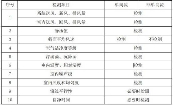 2、下列情况应更换高效过滤器: 1)气流速度降低,即使更换初效、中效空气过滤器后,气流速度仍不能增大时。 2)高效空气过滤器的阻力达到初阻力的1.5~2 倍时。 3)高效空气过滤器出现无法修补的渗漏时。 B.0.3 医药洁净室(区)的维护,应符合下列要求: 1、医药洁净室(区)的维护管理,应包括对净化空气调节系统、生产设备、设施和操作人员的管理,应建立相应的管理制度和记录。 2、使用具有腐蚀、易燃、易爆等有毒有害物品的医药洁净室(区),应有相应的安全措施。 3、应建立医药洁净室(区)计划检修制度,对净化空气调节系统实行定期检修、保养制度。检修、保养记录应存档。 C.0.1 医药洁净室(区)的验证,应包括下列内容: 1、医药洁净室(区)的验证,应包括室内系统及设施,如净化空气、工艺用水等系统及设施的安装确认、运行确认和性能确认。 2、系统及设施的安装确认,应包括各分部工程的外观检查和单机试运转。 3、系统及设施的运行确认,应在安装确认合格后进行。内容应包括带冷(热)源的系统联合试运转,并不应少于8h。 4、医药洁净室(区)的综合性能确认,应包括表 C.0.1 项目的检测和评价。 表C.0.1 医药洁净室(区)综合性能评定检测项目